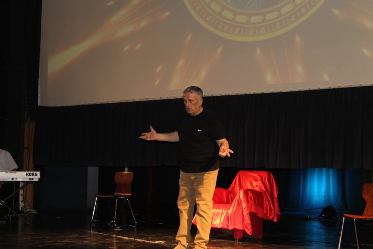 Skena e Qendrës Kulturore “Lasgush Poradeci” në Pogradec u mbush me të qeshura, emocione dhe duartrokitje falë shfaqjes “50 pa 1”, ideuar dhe interpretuar nga aktori, regjisori dhe libretisti i njohur Guri Koço.