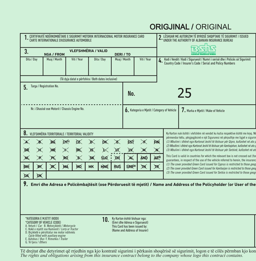 “Kartoni Jeshil” është një dokument sigurimi ndërkombëtar, që mbulon përgjegjësinë e drejtuesve të mjeteve me targa shqiptare në rast aksidenti gjatë qarkullimit jashtë territorit të vendit.