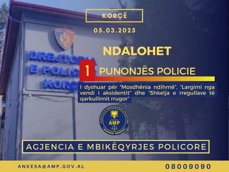 Agjencia e Mbikëqyrjes Policore (Rajoni Elbasan – Korçë) ka ndaluar me iniciativë punonjësin e policisë Inspektor J. R., me detyrë Oficer i Patrullës së Përgjithshme në Komisariatin e Policisë Korçë, i dyshuar për veprat penale “Mosdhënia ndihmë” , “Largimi nga vendi i aksidentit” dhe “Shkelja e rregullave të qarkullimit rrugor”.
