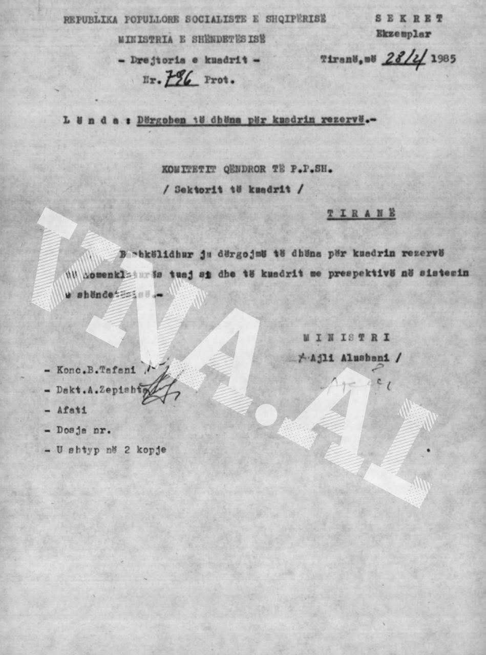 Ështe siguruar ekskluzivisht një material arkivor i Ministrisë së Shëndetësisë, konkretisht Drejtorisë së Kuadrit, e cila, në një shkrese sekrete, i dërgon Komitetit Qendror të PPSH, më 28 shkurt 1985, emrat e si kandidat i mundshëm për ministër të Shëndetësisë edhe Sali Berishën, me të dhënat e profilit të tij.